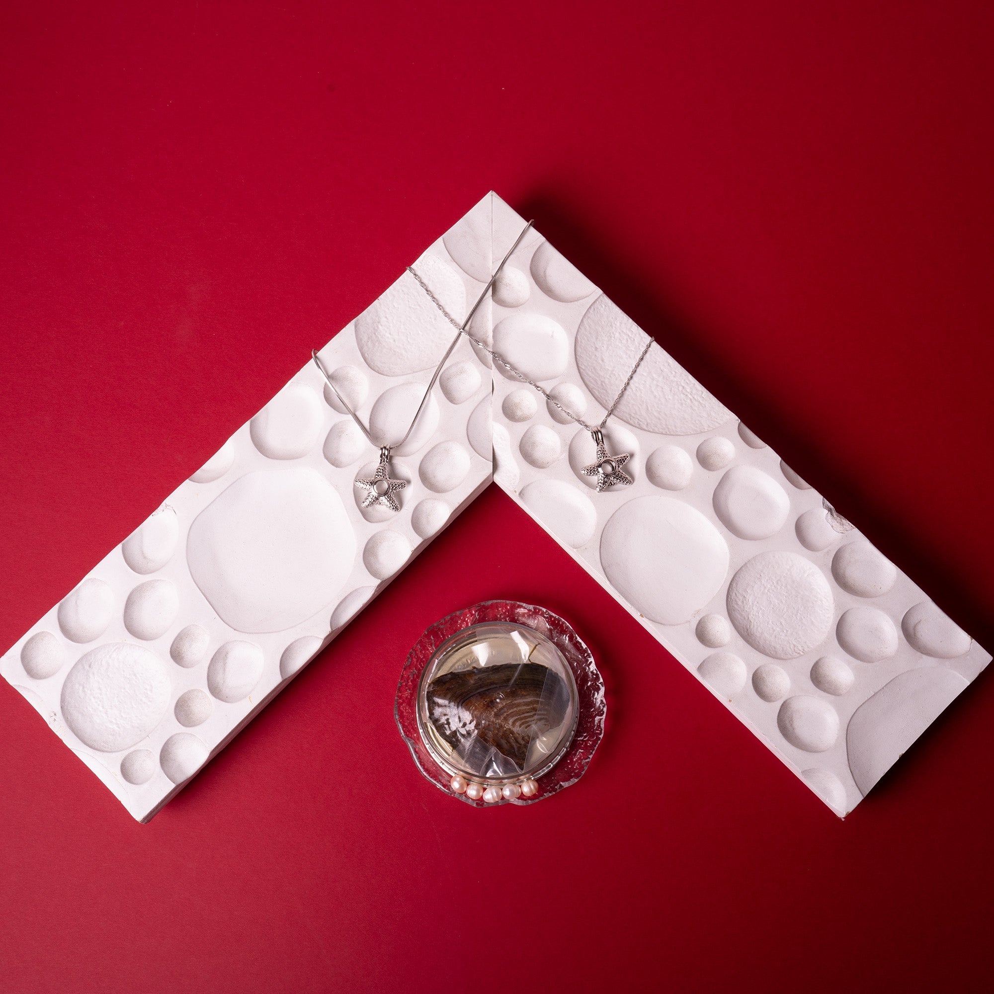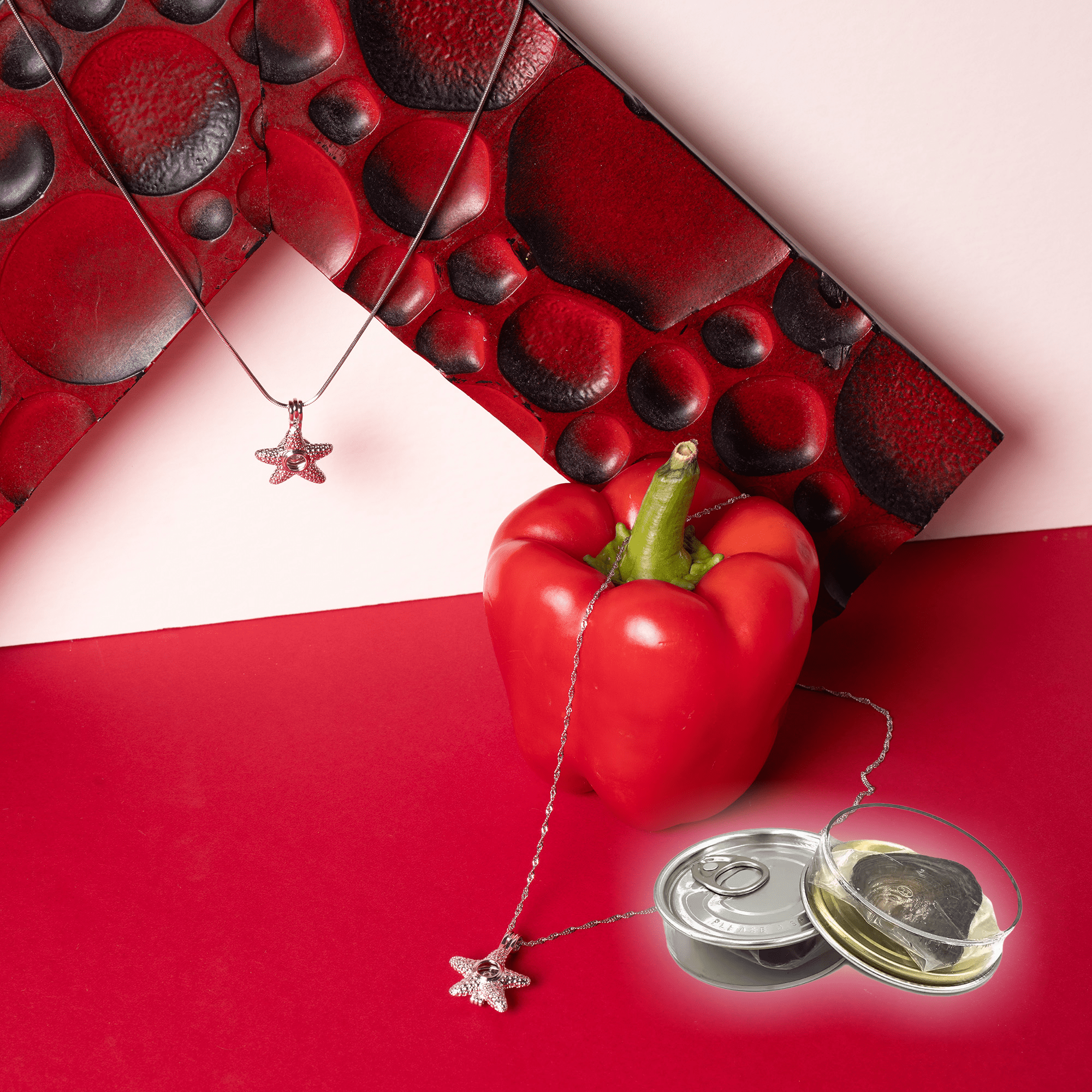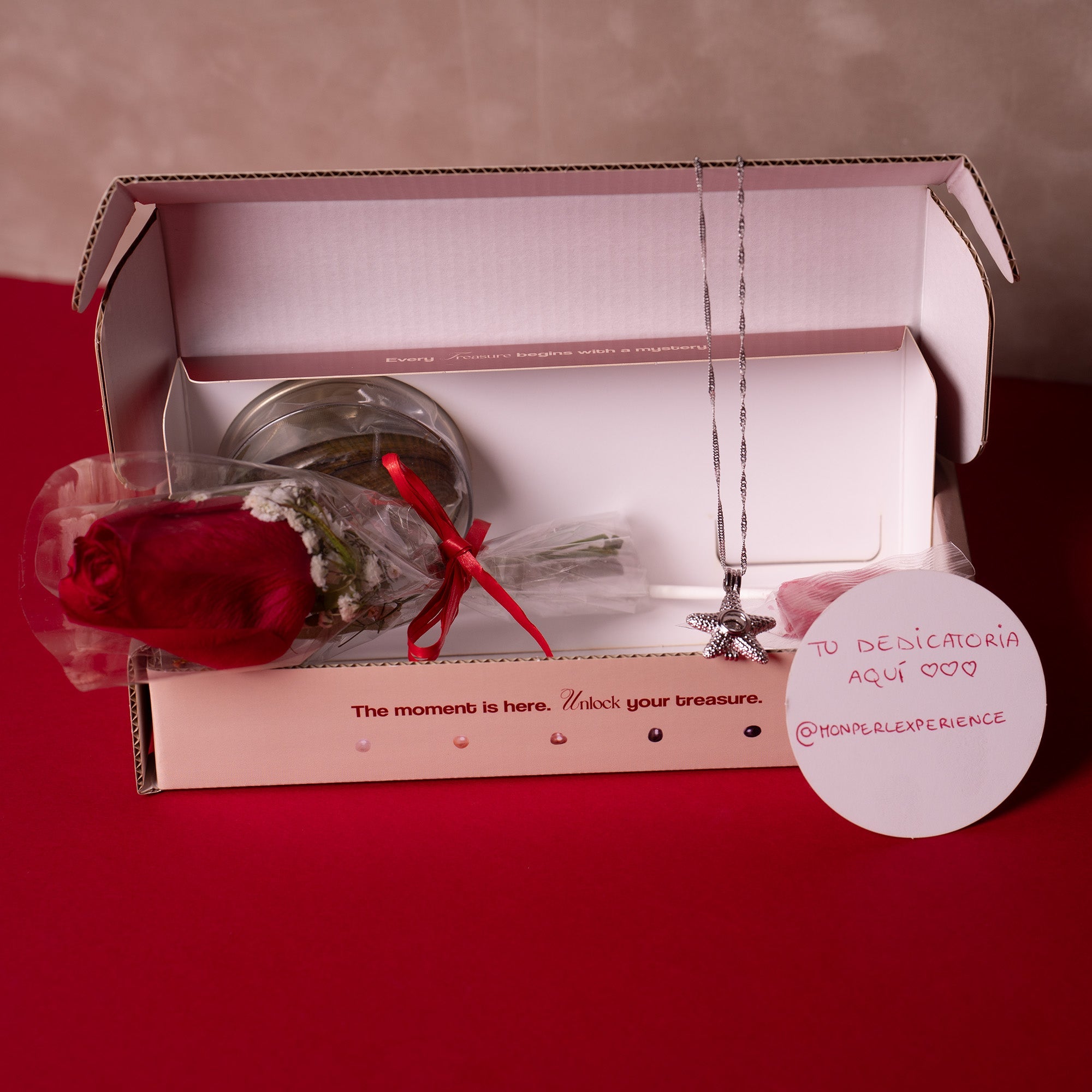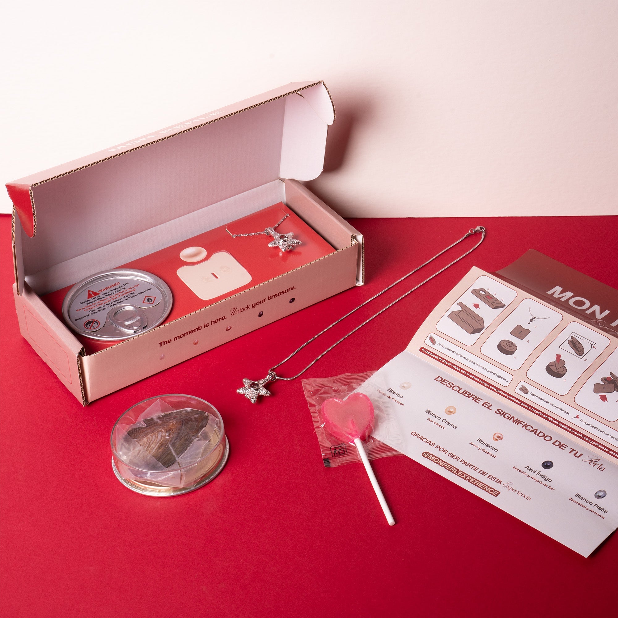 El set incluye un elegante colgante Star con baño de plata, cadena de acero inoxidable (dos diseños disponibles), ostra natural sellada al vacío, herramienta para su apertura, guía de uso y un toque dulce para disfrutar la experiencia.